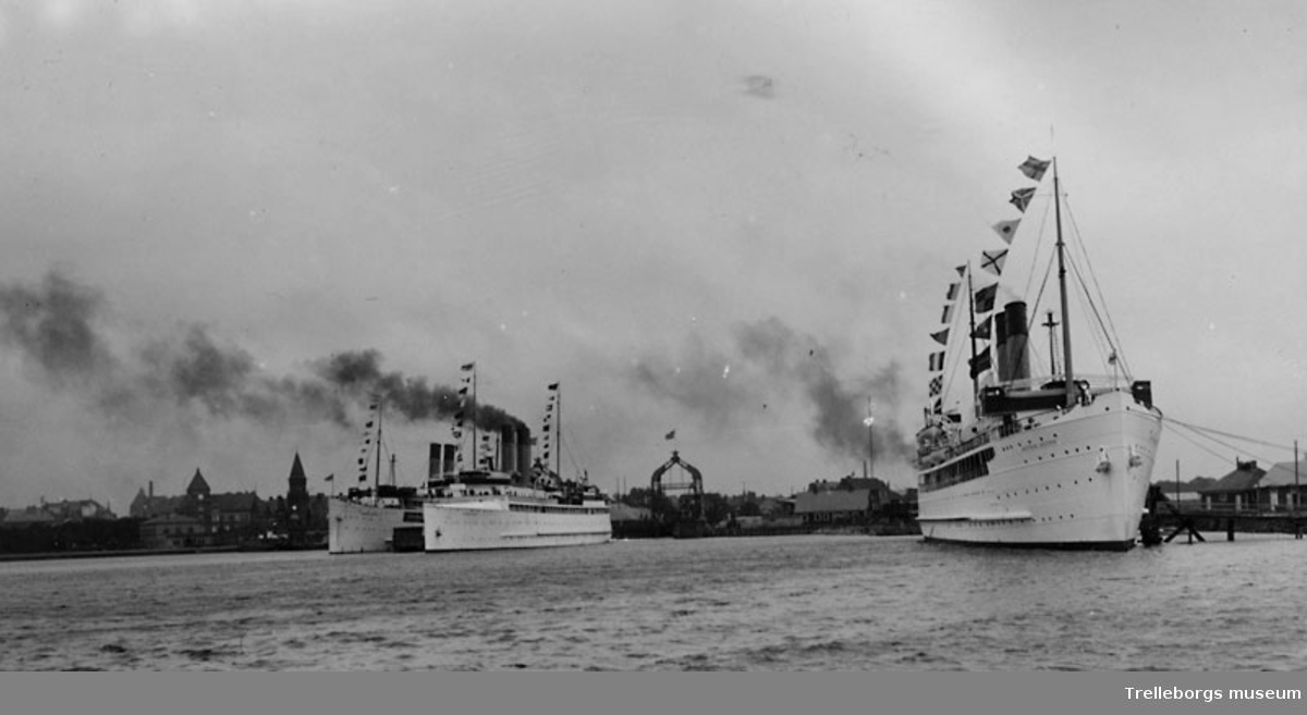 Tre färjor i Trelleborgs hamn: Drottning Victoria, Preussen och Konung Gustaf V.