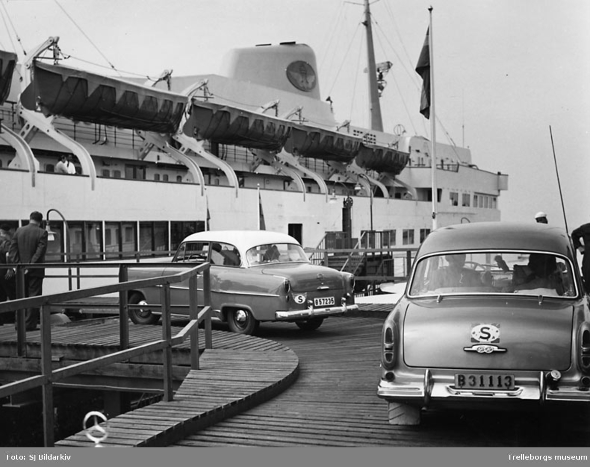 Två personbilar kör in på färjan m/s Trelleborg 1959