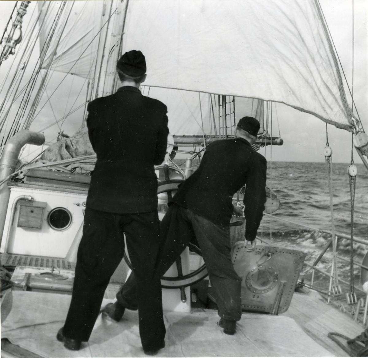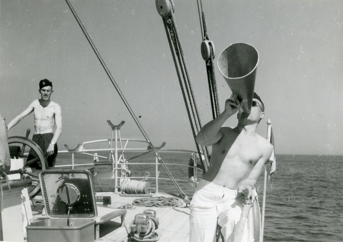 Bilden visar: K. Hallgren, H. Eriksson, Fru Lagergren, Fr. Åkerblom, Lagergren, Gerzén.Fru Brembeck, Törner, Bengtsson, Stenlund, Lagerbeck, Landström, "Skepparn" lämnar Solabåten 1940