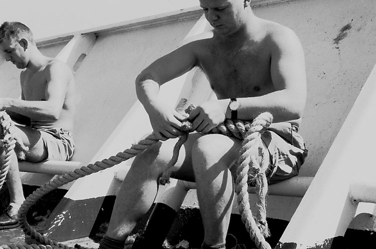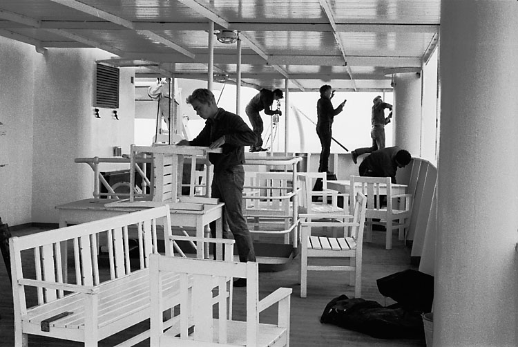 Det ständiga underhållet på fartyget. Här målning av däcket.