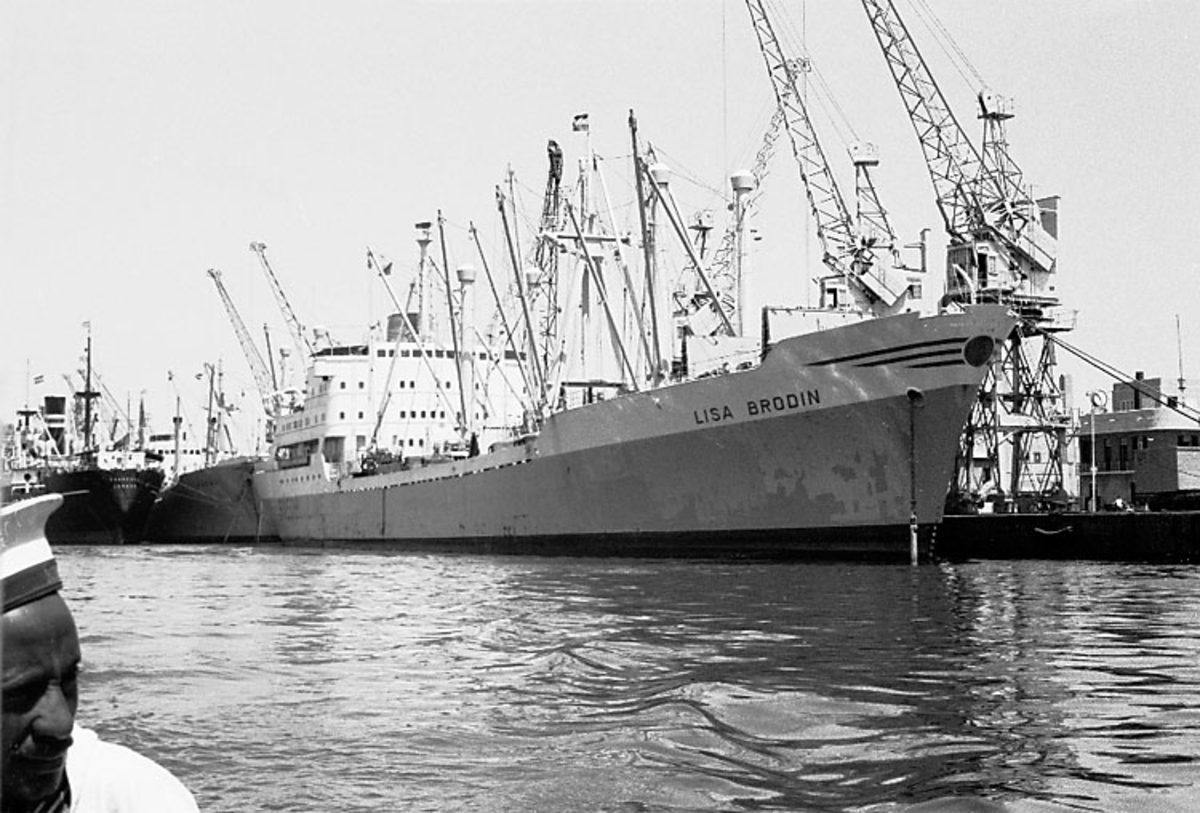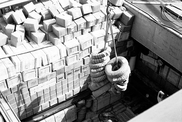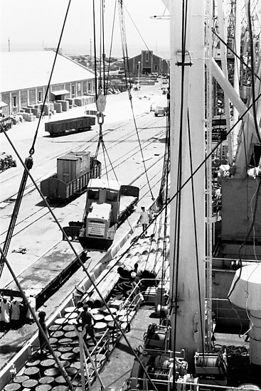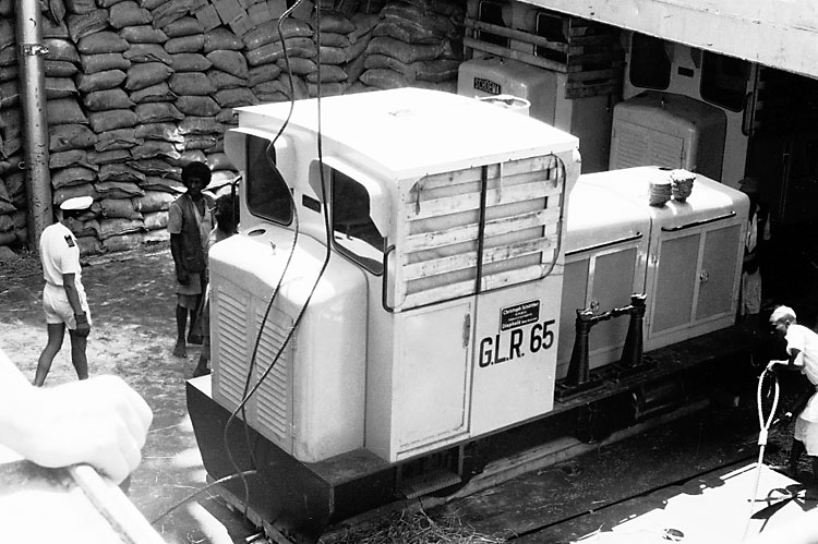 Ett lok håller på att lastas av fartyget i . Port Sudan