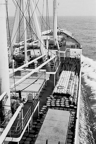 Fotografen står på styrbords brygga och fotograferar för över. Fartyget är under gång.