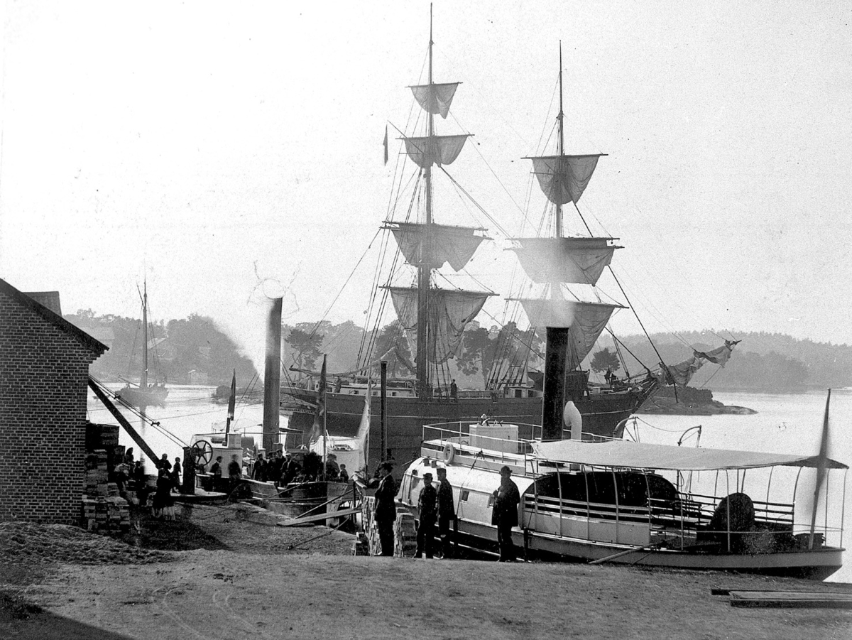 Gustavsbergs hamn år 1873. På fotot ses hjulångaren Wermdö (första båten i Gustavsbergsflottan), ångbåten Gustafsberg I och briggen ........av Figeholm.