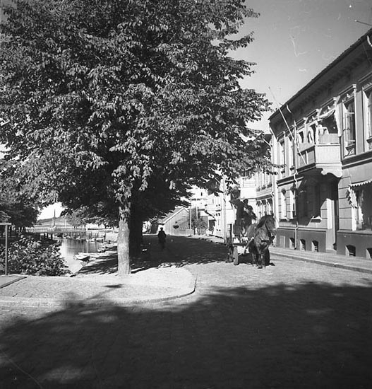 Saedénska huset vid Rådhustorget, en eftermiddag om våren när femtiotalet fortfarande var ungt. Huset uppfördes 1892 och nedrevs 1962. Ett av det gamla Umeås fåtaliga stenhus som trots detta fick skatta åt förgängelsen.