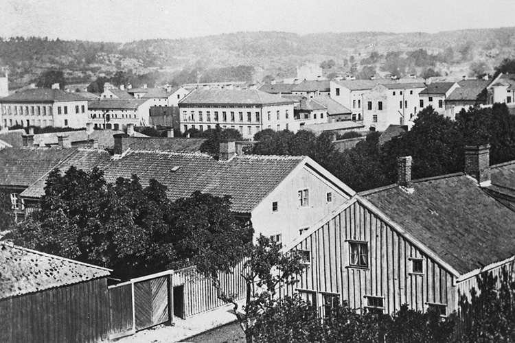 Vy över del av Uddevalla med prästgården och St. Mikaelsgatan 1860.Fotograf:Lundbäck, Maria