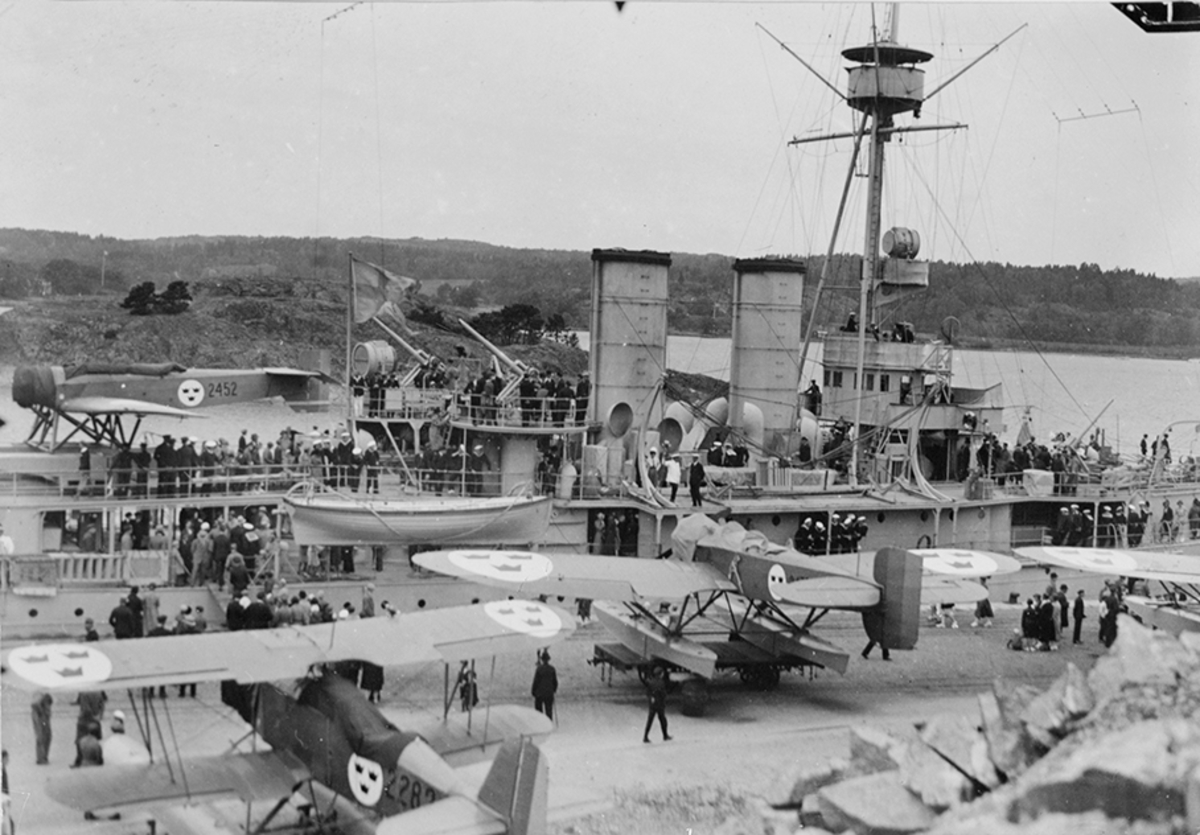 Öppet hus på marinfartyg vid kaj. På fartyget samt framför det står flygplan S 5. Ett flygplan J 4 står i förgrunden, längst till vänster. Människor i rörelse på fartyget. Uddevalla runt 1930