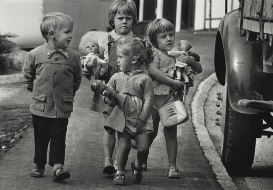 DET VAR PÅ DEN TIDEN FLICKORNA SKULLE LEKA MED DOCKOR OCH POJKARNA MED BILAR. REDAN HÄR PÅ BILDEN SER VI KLART OCH TYDLIGT HUR KÖNSROLLERNA GER KLARA SIGNALER VAD SOM GÄLLER. POJKEN MED HÄNDERNA PÅ RYGGEN MEDAN FLICKORNA SLITER MED BARN OCH VÄSKOR. iNTE KONSTIGT ATT VI 40 -50 TALISTERS HERRAR BLEV SOM VI BLEV.
